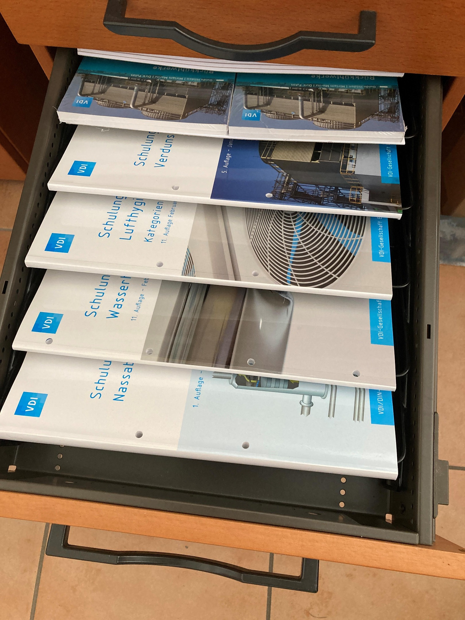 Wissen kann man einfach und überall hin mitnehmen, ohne dabei etwas tragen zu müssen - und man hat beide Hände frei! - Eine Schublade voller Wissen zum Nachlesen ist dennoch immer hilfreich, so wie hier der vollständige Satz der VDI Schulungsunterlagen der jeweiligen VDI Hygiene -Qualifikationen.