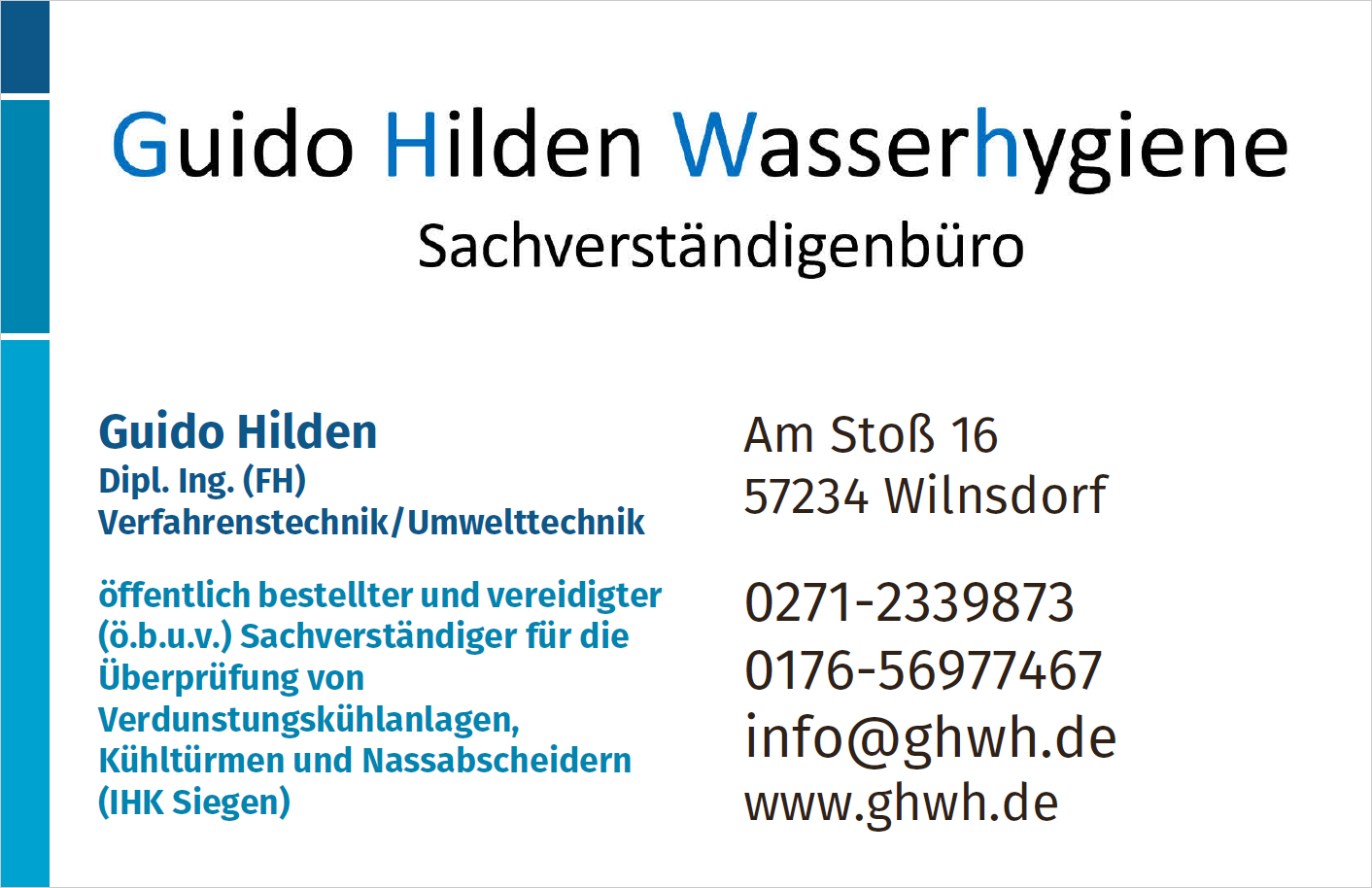 Ich beschränke meine Dienstleistung als öffentlich bestellter und vereidigter Sachverständiger ausschließlich auf beratende und allgemein untersuchende Tätigkeiten, die ich nebenberuflich und unabhängig zu meiner Hauptbeschäftigung bei der Schweitzer-Chemie GmbH für mein freiberufliches Einzelunternehmen Guido Hilden Wasserhygiene erbringe.