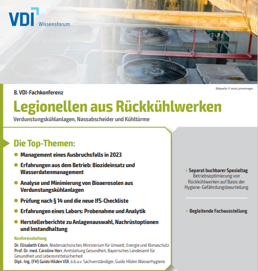 Die 9. VDI-Fachkonferenz “Legionellen aus Rückkühlwerken“ am 12.03. und 13.03.2025 in Mannheim im Dorint Hotel bot einen sehr guten Austausch unter Beteiligung aller interessierten Kreise. - Wir freuen uns schon, auf das Jubiläum zur 10. VDI-Fachkonferenz “Legionellen aus Rückkühlwerken“ am 10.03. und 11.03.2026 wieder in Mannheim im Dorint Hotel.