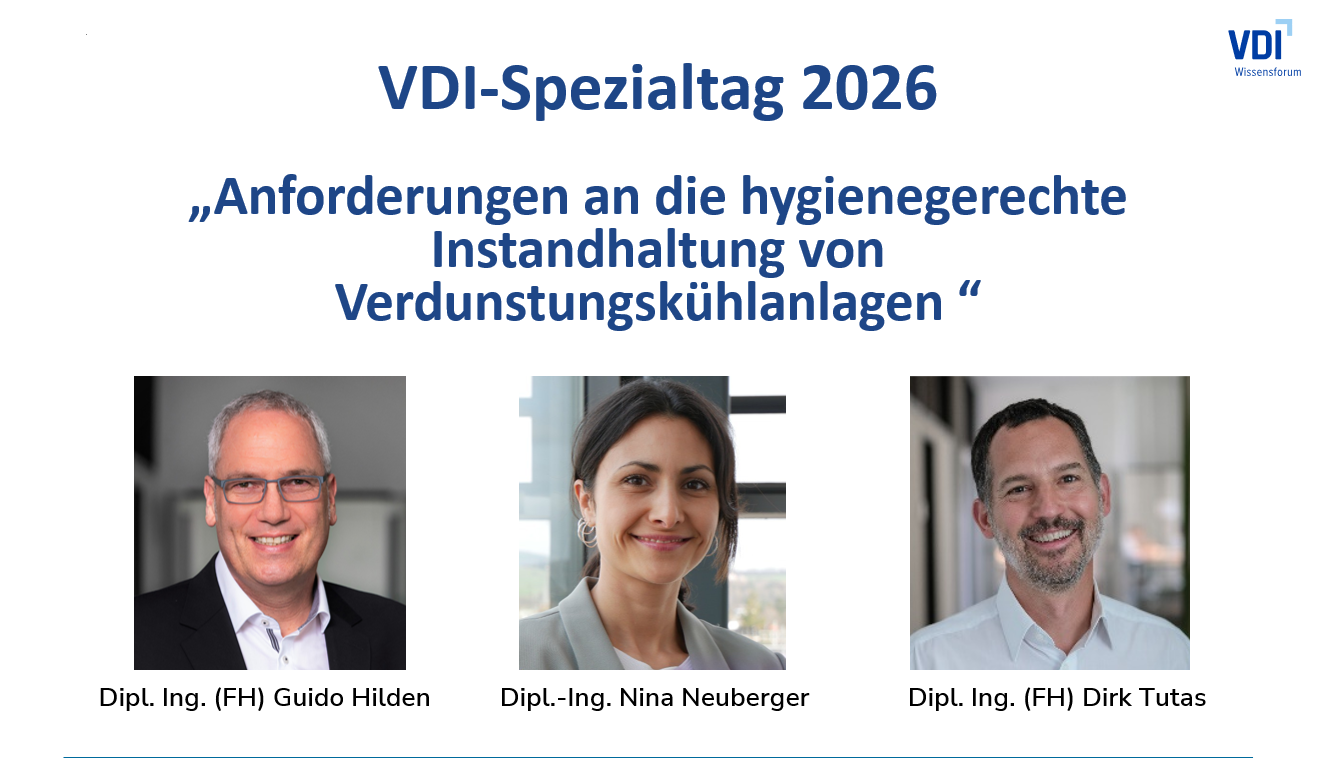 Am 15.09.2022 fand die VDI NRW Netzwerk Session "Legionellenrisiko – Technische Hygiene in Verdunstungskühlanlagen" mit fast 100 Teilnehmern statt. - Für VDI Mitglieder ist der Vortrag als Aufzeichnung abrufbar.