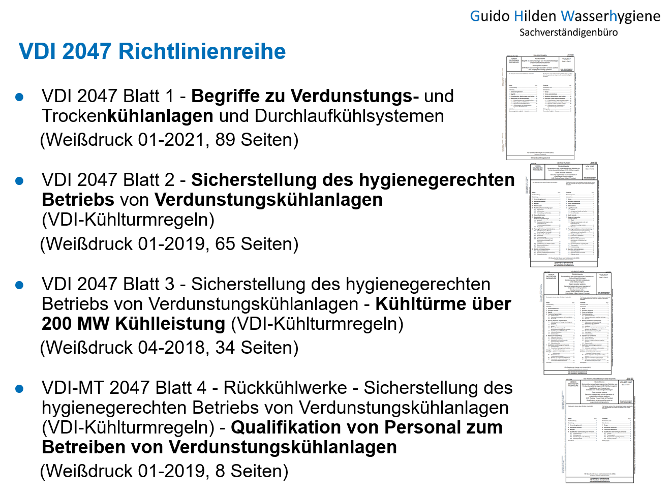 Im Januar 2015 wurde die VDI 2047 Blatt 2 erstmals im Weißdruck veröffentlicht und so ein neues technisches Regelwerk für Verdunstungskühlanlagen als allgemein anerkannte Regel der Technik gesetzt, welche die Möglichkeit der Qualifikation durch Schulungen anbietet. 2018 wurde mit der VDI 2047 Blatt 3 ein eigenständiges Blatt für Naturzugkühltürme in der Richtliniereihe ergänzt.