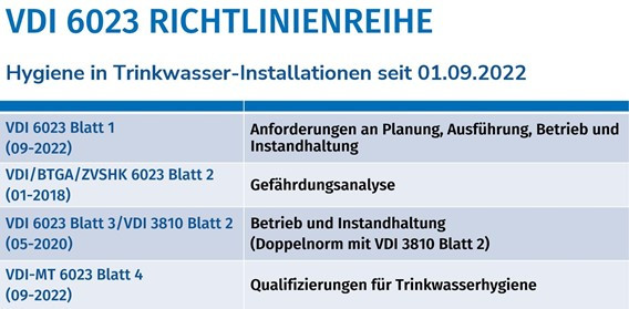 Die Richtlinienreihe zur VDI 6023 für Trinkwasser-Installationen ist seit September 2022 vervollständigt und ist ein sich geschlossenes Regelwerk zur Hygiene in Trinkwasser-Installationen.